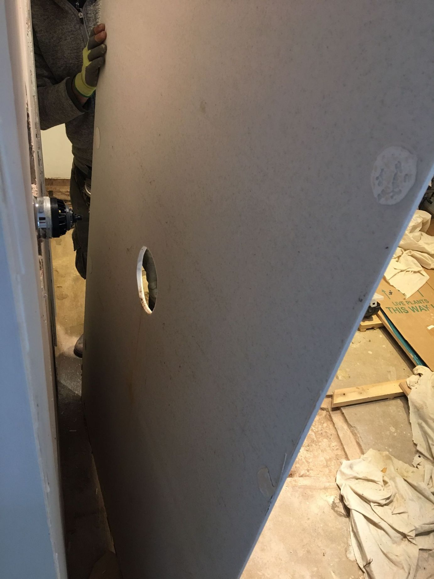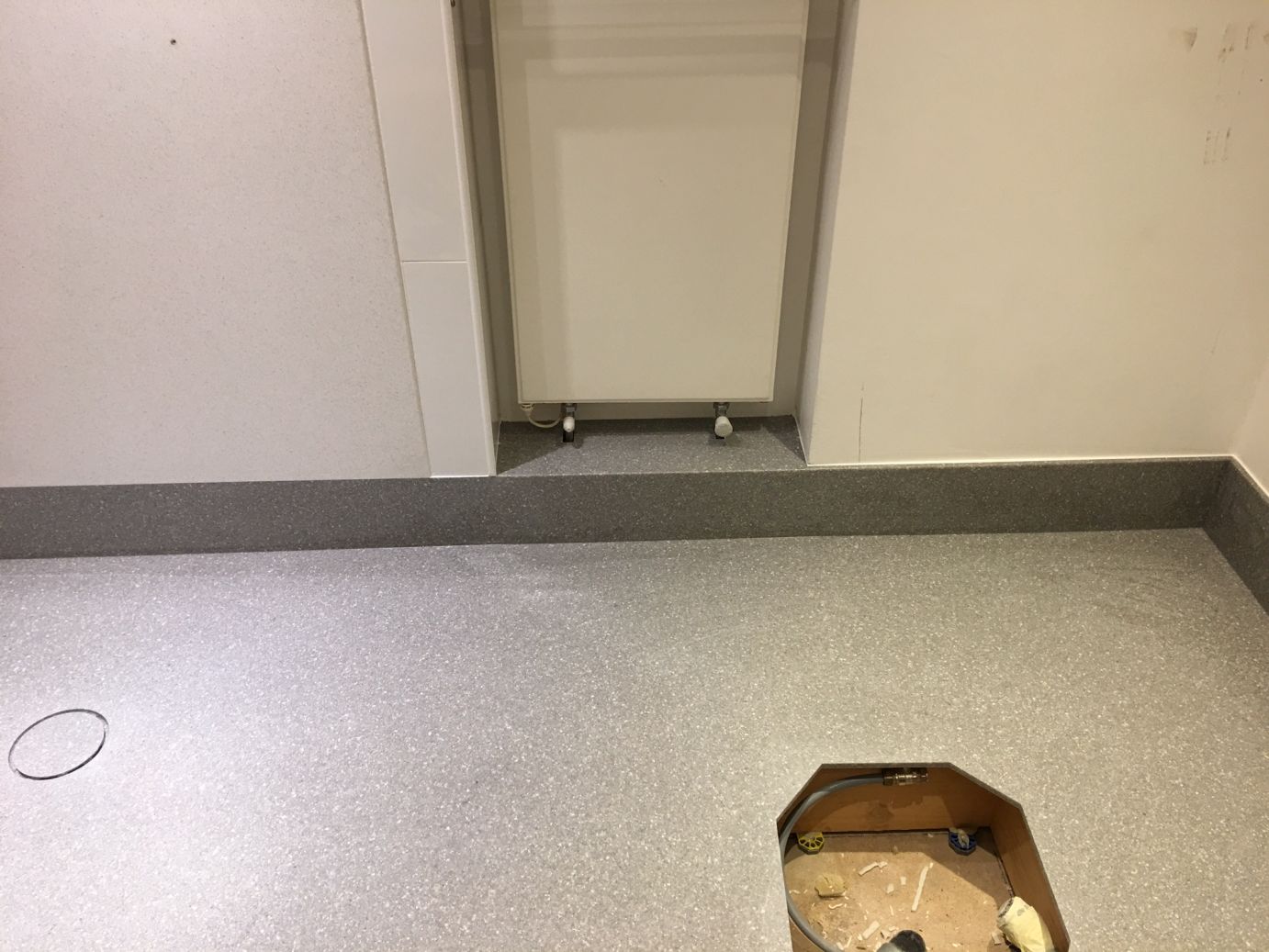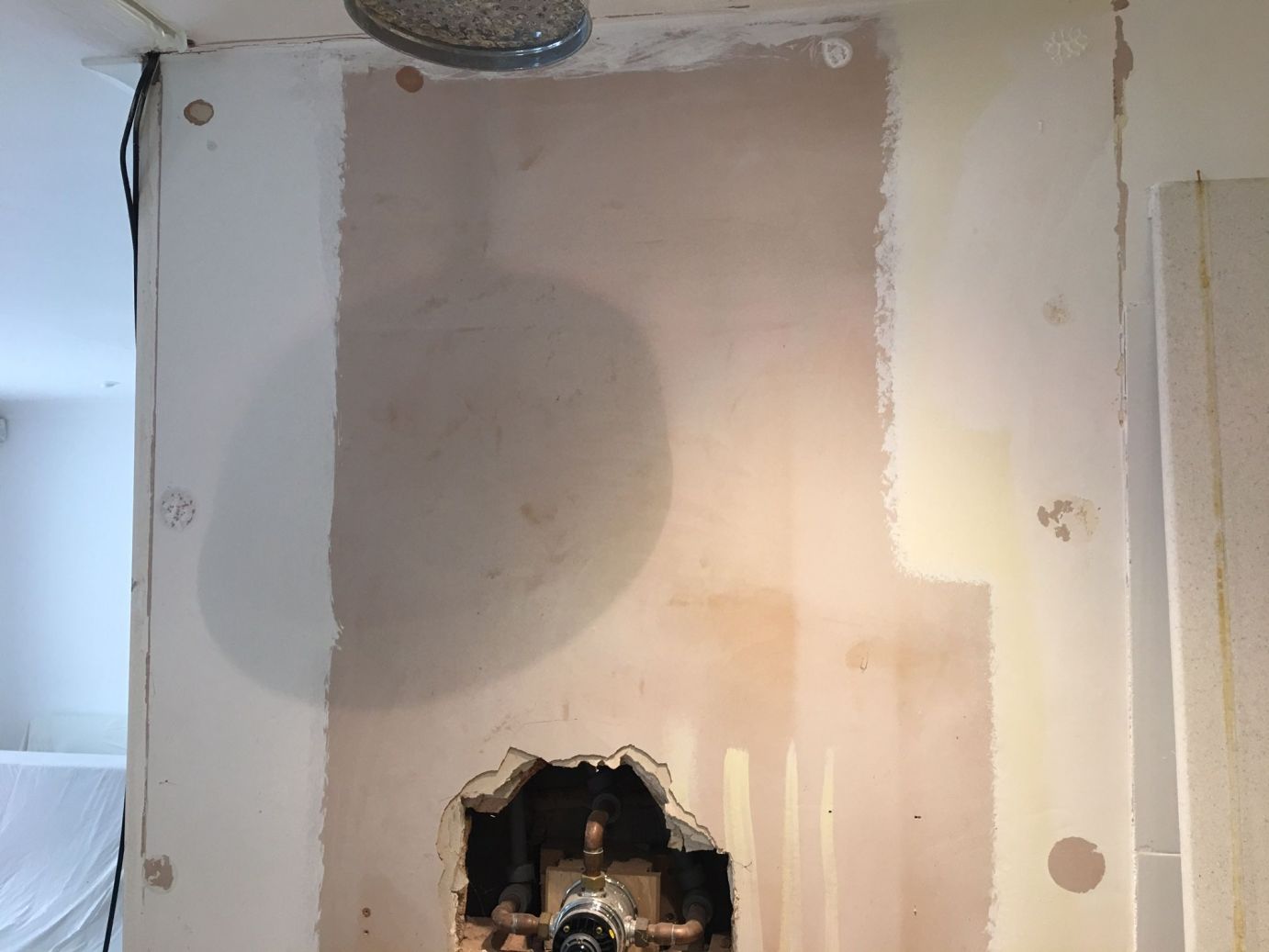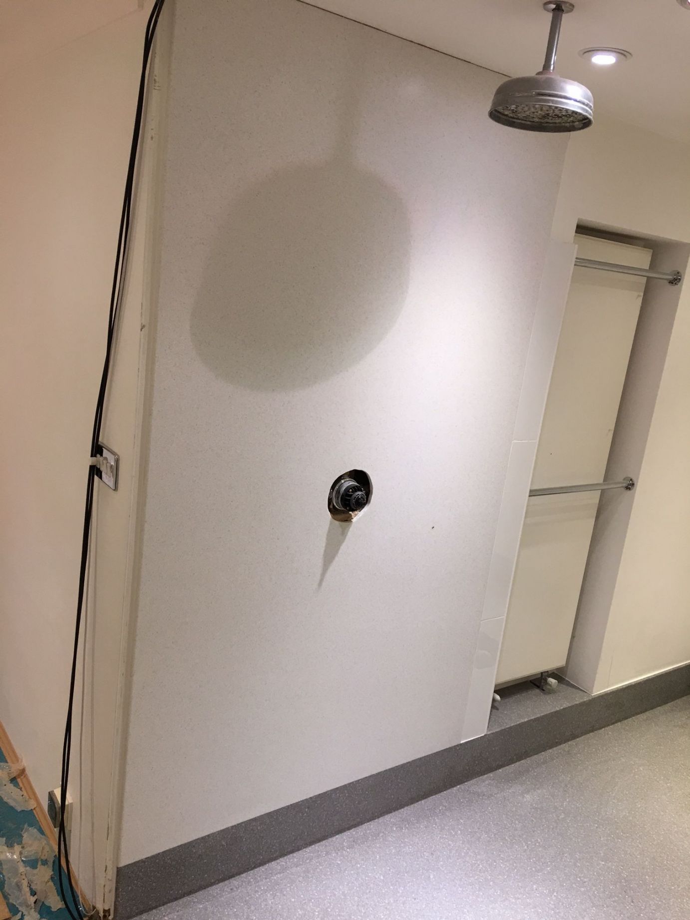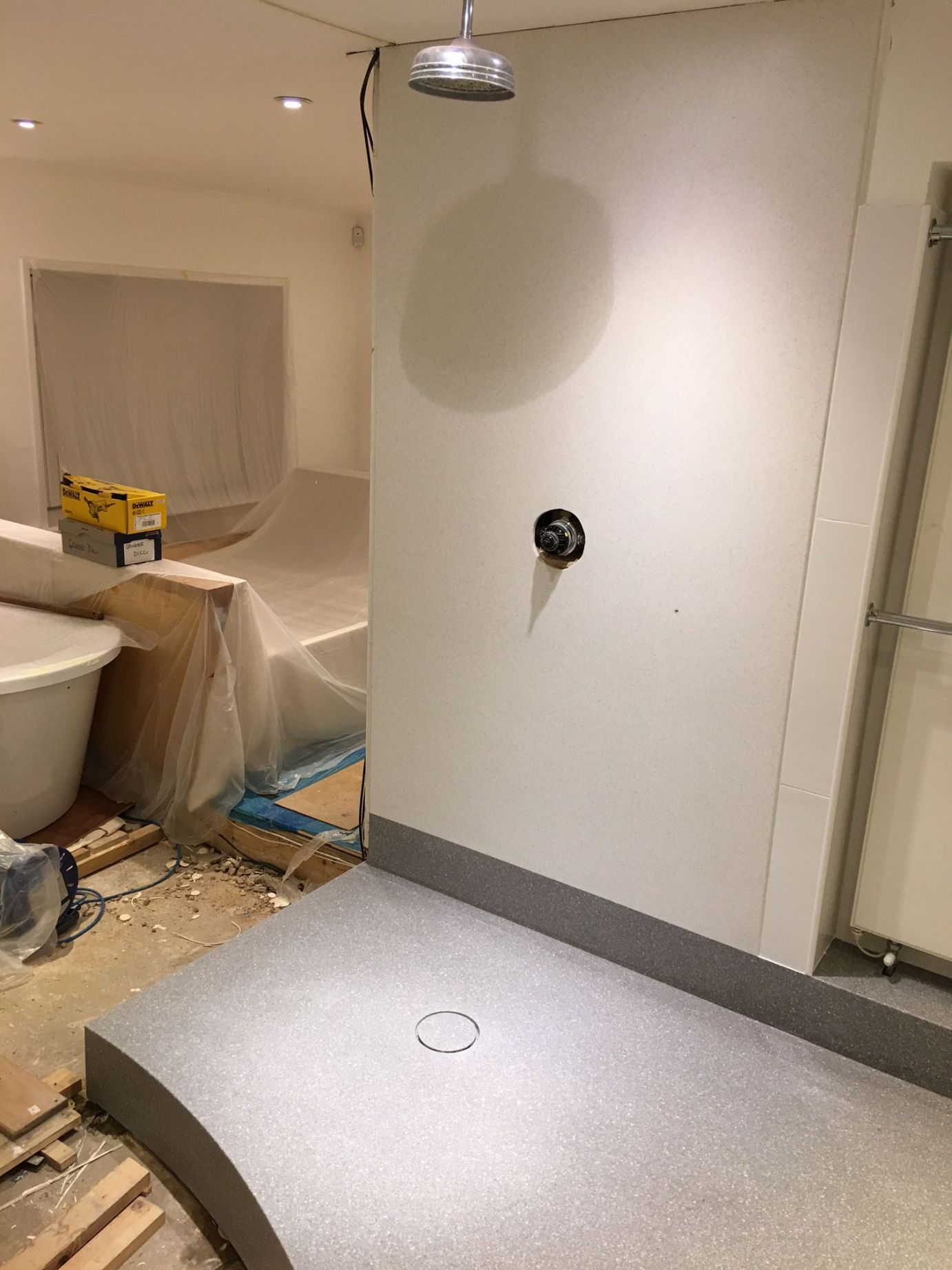 We removed the old floor and templated for a Solidity replacement. As we tidied up, the bottom of a Corian Everest wall panel popped and dropped. It had only been stuck to the wall with a few blobs of silicone. Now the only thing holding the panel to the wall was the shower valve and a couple of screws. We propped it, made it secure for plumbers to remove and make safe the valves.