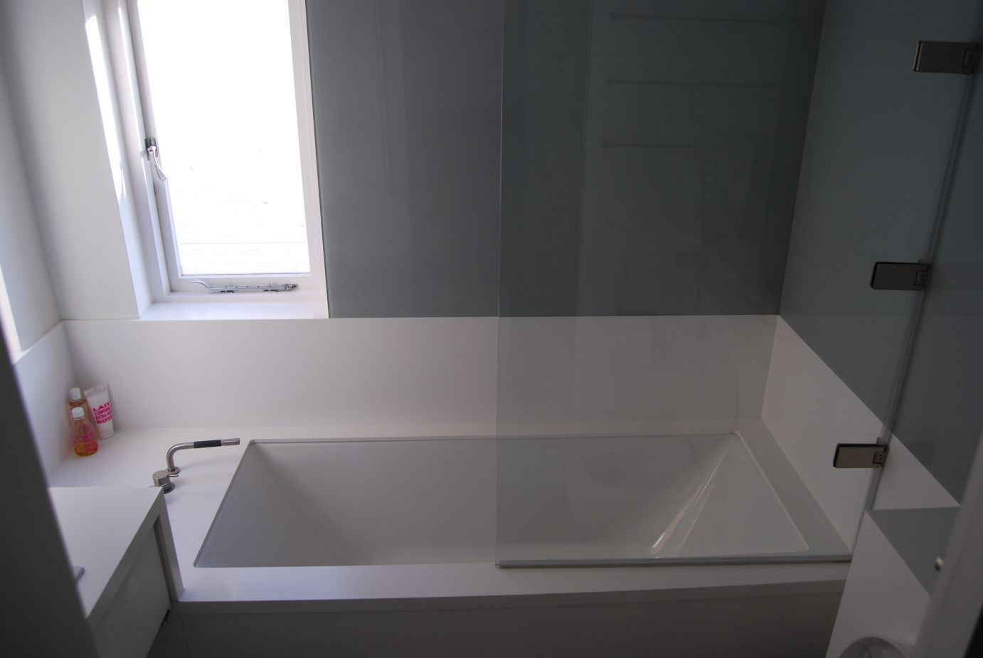 Alpine White Hi-MACS has been used in this contemporary bathroom on a number of surfaces. There is an overbath surround which continues to wall panelling up to window height. At one end of the bath the panelling flows up to become part of a bespoke vanity unit. At the other end of the bath the HI-MACS continues up to a cistern cover for the WC. The grey wall panels are painted glass.
