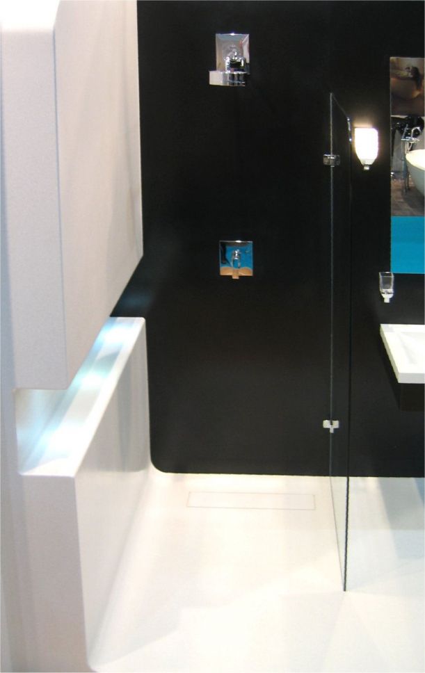 This shower space was made by us to showcase at Grand Designs Live. Notice the coved base of the shower tray joining without grout to the wall panel. This coved theme continues up the wall where we've created an integrated shelf with down lighting. The one piece seamless style of a Solidity wet area creates a truly water tight space and makes for easy cleaning. To create a contemporary look we chose a contrasting black wall panel to the rear.