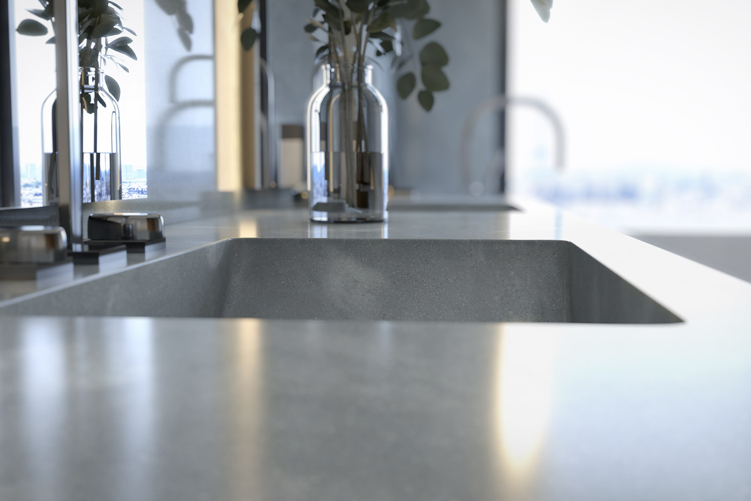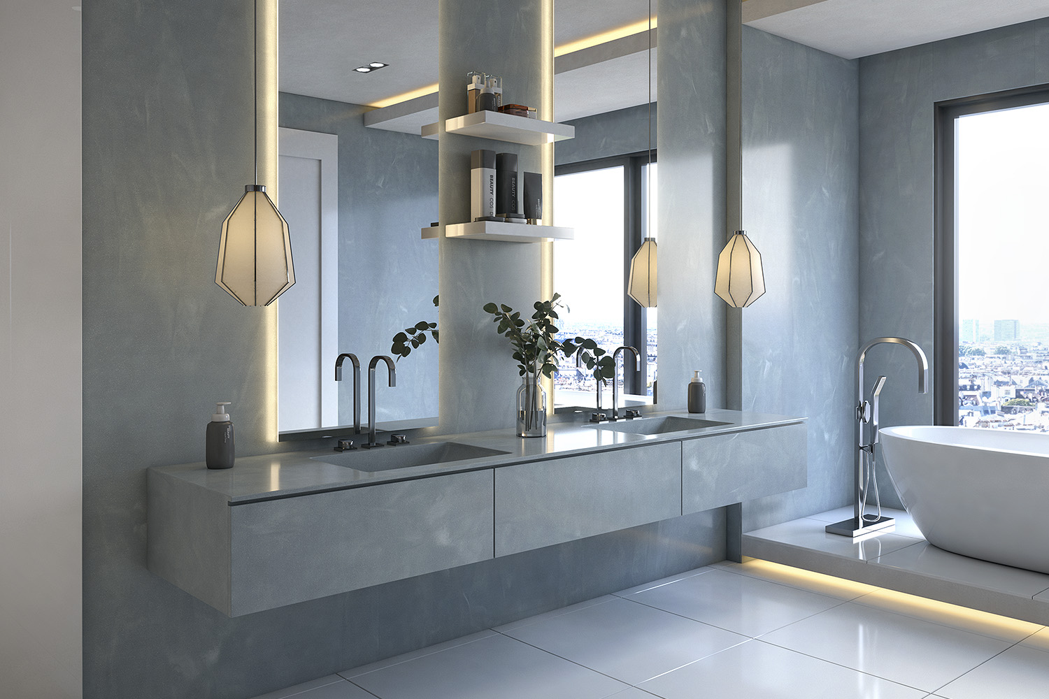 As though appearing from a soothing vapor, Corian Artista Mist is a quiet, soft blue with almost cloudlike white veins and particles. The look is airy, slightly mysterious, and fresh. It envelopes any space with ease and calm. Ideal for health and wellness centers, it is also comforting in home, hotel, and education spaces.