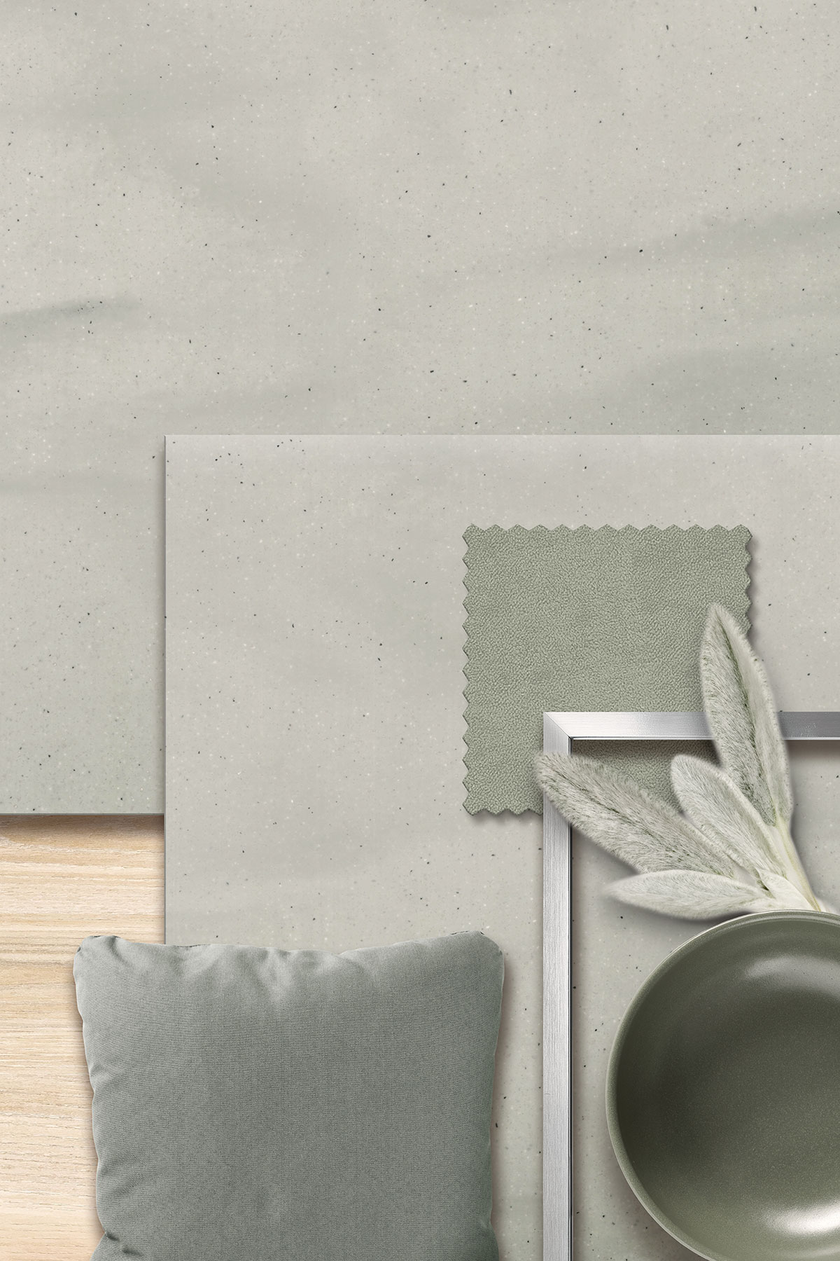 Muted and soft, the visual look of Corian Artista Sage almost evokes a scent of an herb garden. From within the most subtle of greens, grey veining and particles underscore the lowkey colour. Natural, indeed, it exudes nature at its most soothing and reassuring. It is a colour, and design, that invites quiet and can add a moment of calm to commercial spaces as well as home and office.