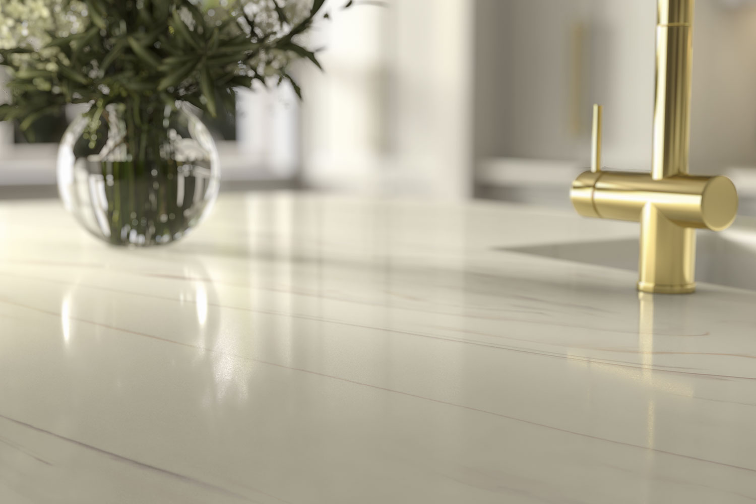 Corian Calacatta Greige is a beautiful synthesis of classic stone aesthetics with the quiet power of flowing veins. Creating harmony with both beige and grey veining in a warm white background, the design is very much of the earth with a reserved and contemplative aura. Veins trace through the surface to graceful effect in any application from home to office to hospitality.