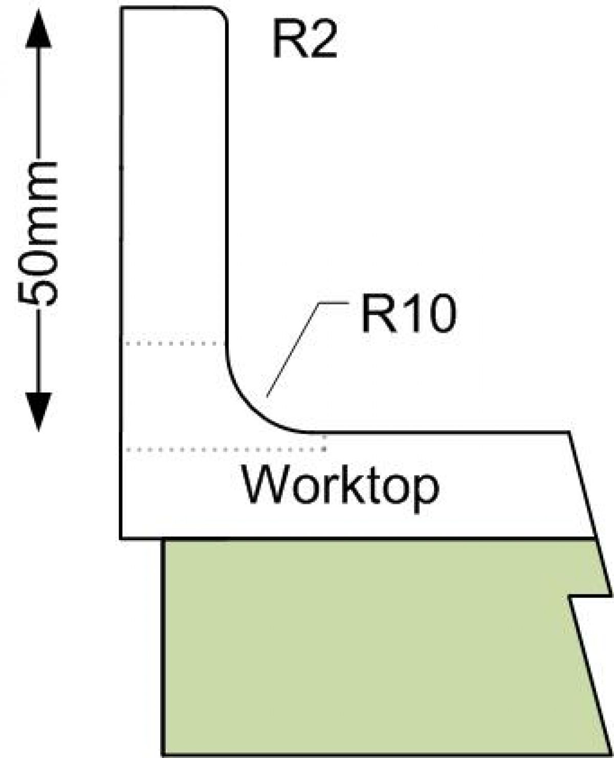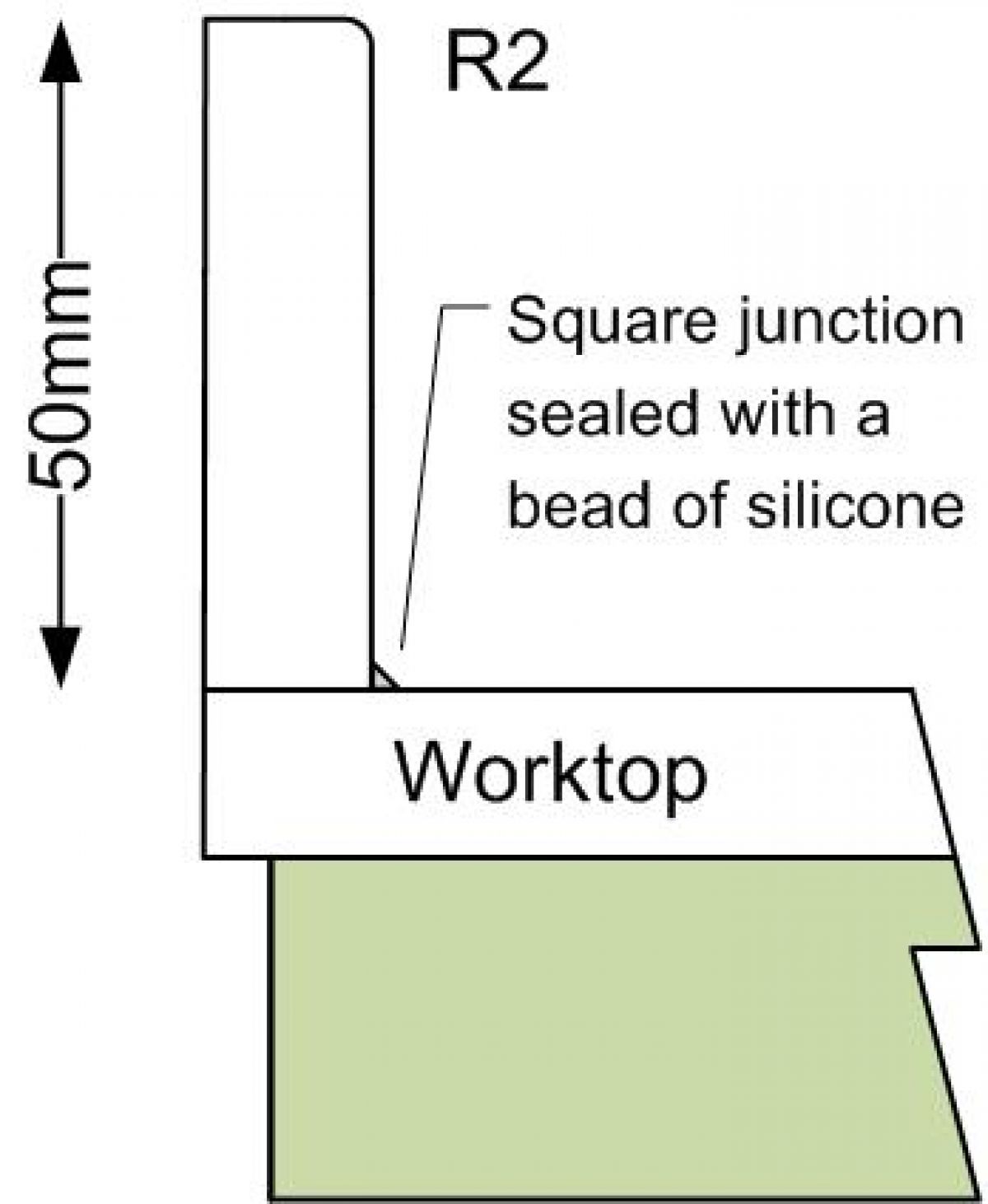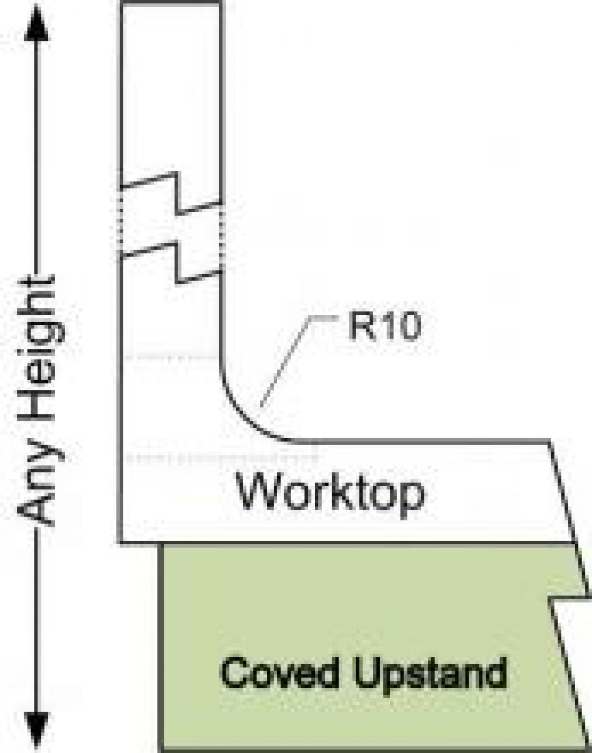 We would always recommend some sort of protection for the wall covering at the back of worktops. 10mm coved upstand is the best choice to meet glass or tiling. A 50mm upstand is a popular choice for a decorated wall. Often splashbacks are specified much higher than this, especially in the hob area. Coved upstands, although more expensive, look beautiful and give a stunning finish to your installation. They also have the advantage of making cleaning much easier - preventing dirt and grime collecting at the wall/worktop junction.